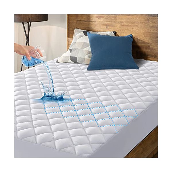 - PROFESSIONAL DESIGN & CRAFTSMANSHIP: Our mattress protector is box quilted, the interior microfiber is filled evenly and smoothly. Prevent night fill shifting from affecting sleep. And combed fibers make the filling more fluffy and soft.Excellent waterproof design allows you to sleep without worrying about fluids, sweat or urine leaking through the protector to damage your precious mattress. Give you peace of mind at night