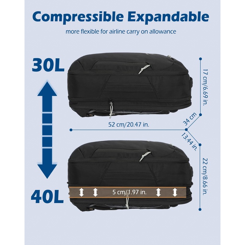 - 【Compressible Carry On】Made of water repellent 420D nylon and 210D polyester lining, carry on backpack expands from 30L to 40L, fitting most of IATA carry on sizes and overhead compartments. Approx. Dimensions: 20.47 x 13.44 x 8.66 inches (52 x 34 x 22 cm) when expanded, and 20.47 x 13.44 x 6.69 inches (52 x 34 x 17 cm) when compressed. Approx. Weight: 2.79 lbs/ 1.27 kg
