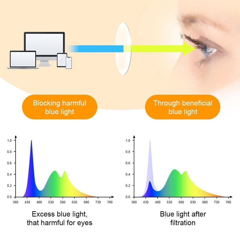 blue light blocking glasses block some of the high-energy blue light emitted from electronic devices like Phones, TVs. It goes by a few different names. You might hear them called computer gaming glasses, anti glare radiation reflective migraine eye glasses or blue light filter UV PC glasses Sometimes, they're just called blue blockers glasses for women men and blue screen gamer glasses. and it can be use for adult fashion fake glasses. How best bluelight block glasses work? When something produces light, different colors vibrate at different wavelengths. blue tinted glasses and blue ray glasses can be block harmful blue light. Mens protective blue light blocking glasses and womens no glare blue light blocking safety clear lens glasses, The glasses frame lenses are designed to help reduce the occurrence of digital eye strain and avoid circadian rhythm cycle disruption, affecting sleep and overall well-being. bue light glasses block a percentage of this light with a special coating that reflects some of the blue light away from your eyes. Glare free glasses and uv protection glasses are often associated with two potential benefits: reduced eye strain and better sleep. Research shows that wearing non prescription bluelight blocker glasses three to four hours before bedtime can lead to better and more restful sleep.