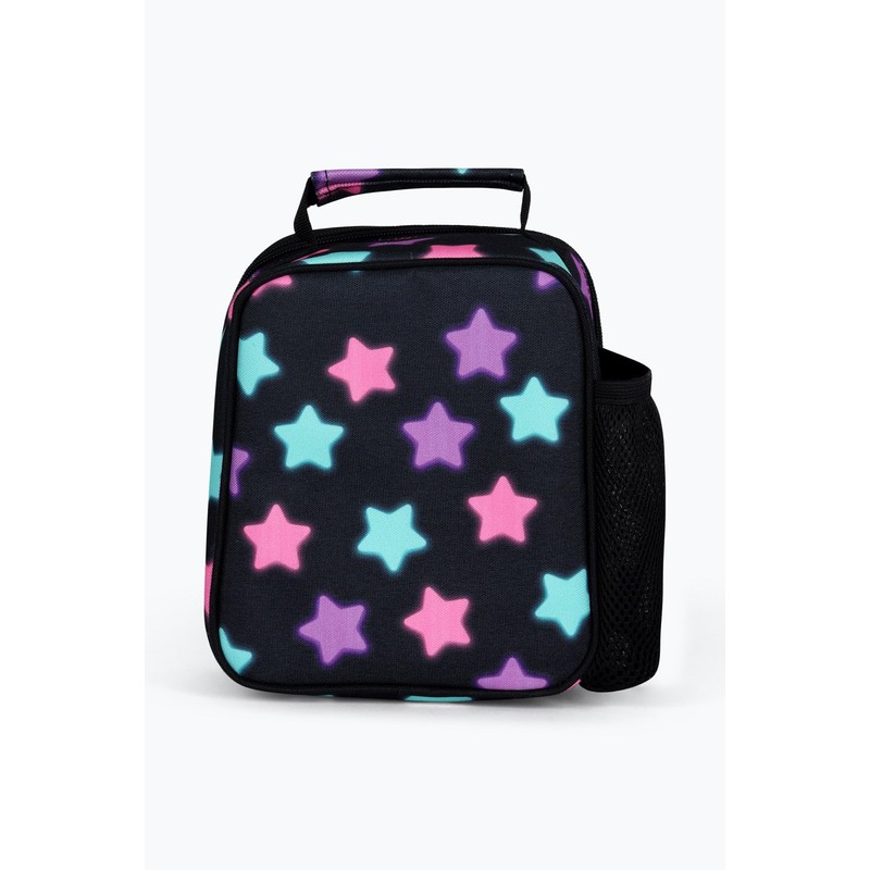 hype Unisex Lunch Box, Black with Pink, Purple & Blue Glow Stars, School Bag for Kids, Stylish Lunch Bag with Bottle Holder, 3 Storage Compartments, Inside Thermal Lining & Grab Handle
