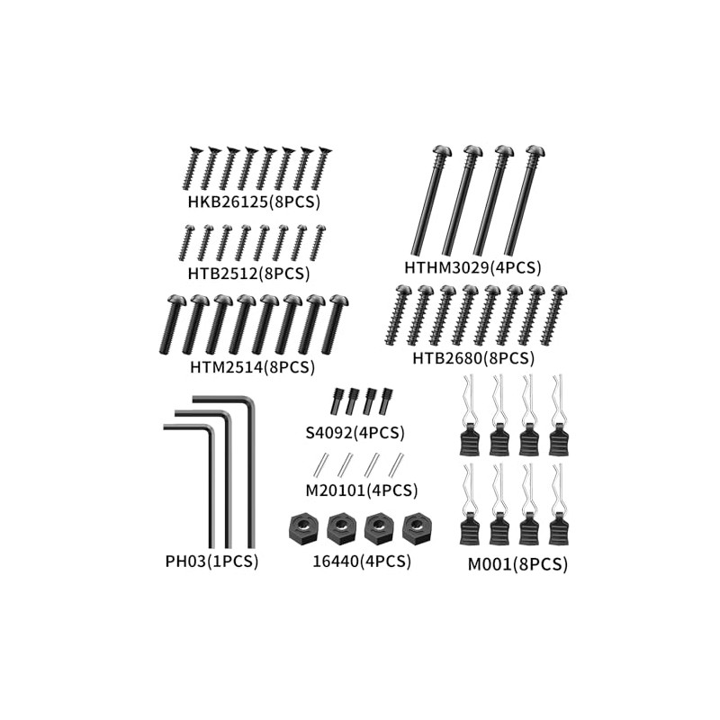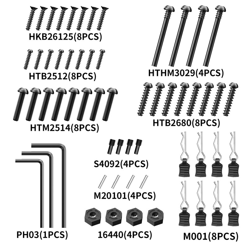 - Accessory kit includes: 8X HKB26125, 8X HTM2514, 8X HTB2680, 8X HTB2512, 4X S4092, 1X PH03, 4X HTHM3029, 4X M20101, 4X 16440 8X M001