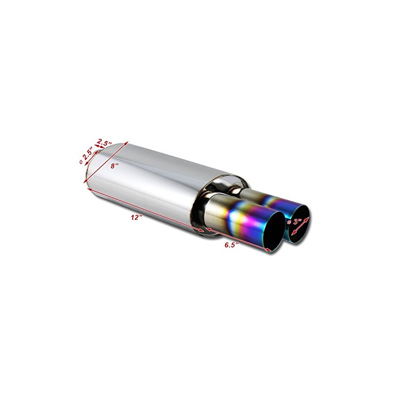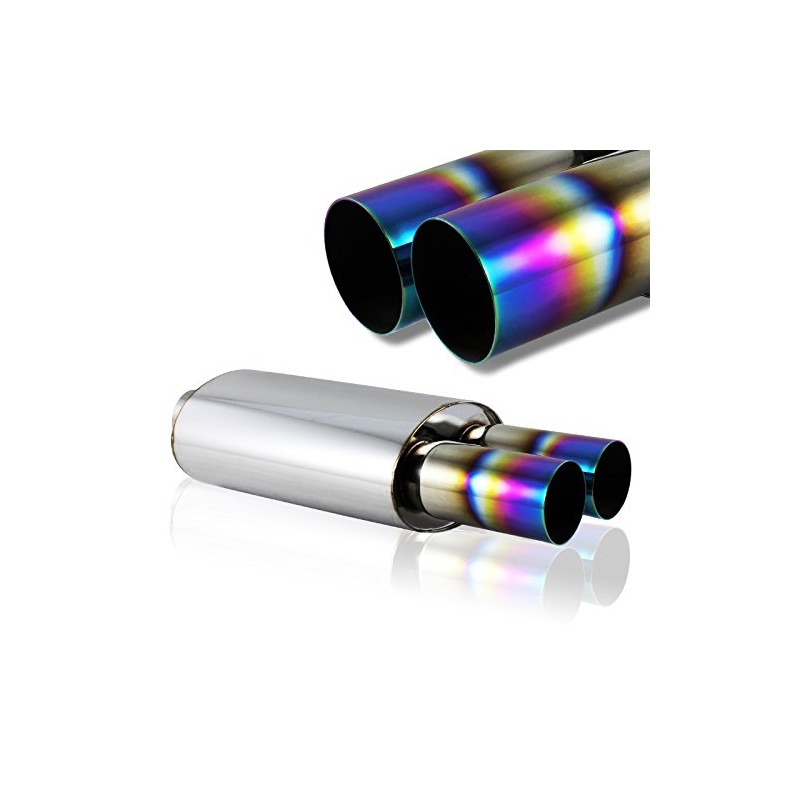 HYPERSPEED Universal DTM Style 3" Dual Flat Tip 2.5" inlet Weld-On Exhaust Muffler Vibrant Resonator T-304 Stainless Steel, Auto Replacement Parts Assembly, Car Mods Accessories (Rainbow Burnt Tip)