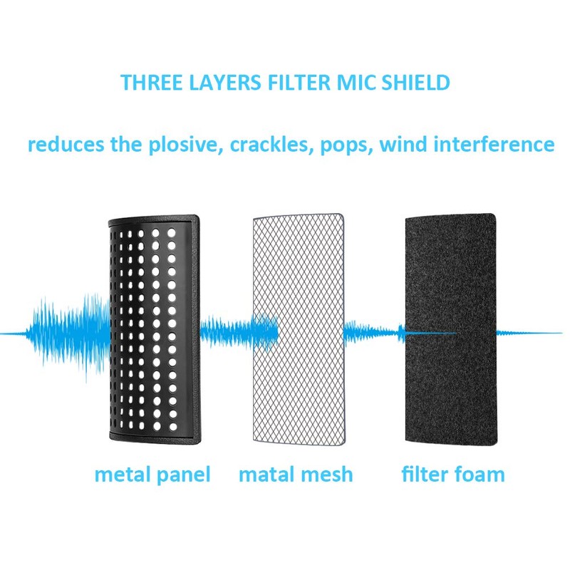 HyperX QuadCast Mic Pop Filter with Three layers design include metal panel layer, matal mesh laye and filter foam layer can effectively reduces the plosive, crackles, pops, wind interference, breath sounds when recording vocals. Absolutely necessary for recording, speaking or singing. This studio mic shield isolation helps to get your best vocal recording.