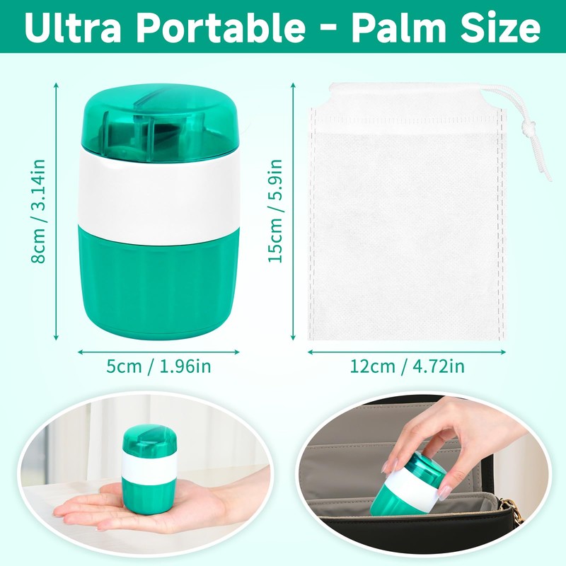 √ Efficient rotating mechanism grinds pills into fine powder; remaining powder can be stored in the built-in compartment, without the need for an additional medicine bottle.
