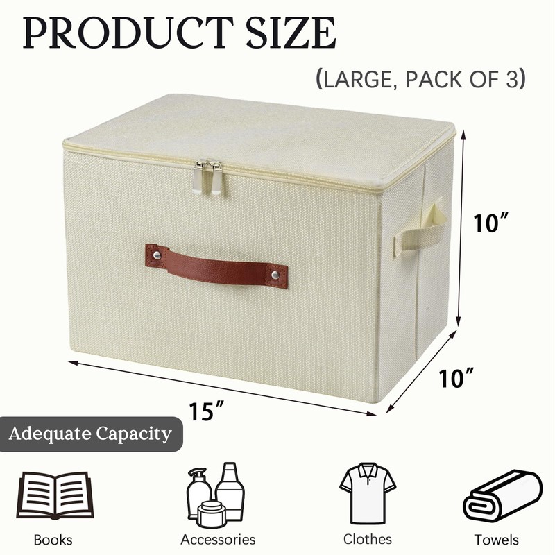 HYVAKUPPA 3 Pack Storage Bins with Zipper Lid Fabric Lidded Storage Boxes Baskets Cubes Washable Collapsible PU Leather Handle Cotton Linen Fabric Shelf Closet Organizer Container(Beige, Large Size)