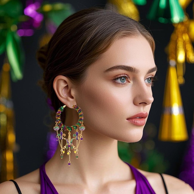 - Mardi Gras means colorful parades,dancing,glittering costumes and extravagant balls.Wish you meet a Happy Mardi Gras when you wear our purple green gold Mardi Gras hoop earrings,these Mardi Gras accessories will be sure put you in the Mardi Gras spirit!Featuring a high polish hoops wrapped with glitter sequins and adorned with fleur de lis,mask,crown charms and chain tassel dangles.Get parade party ready and make you shine and bounce through your Fat Tuesday celebration in these Mardi Gras Earrings