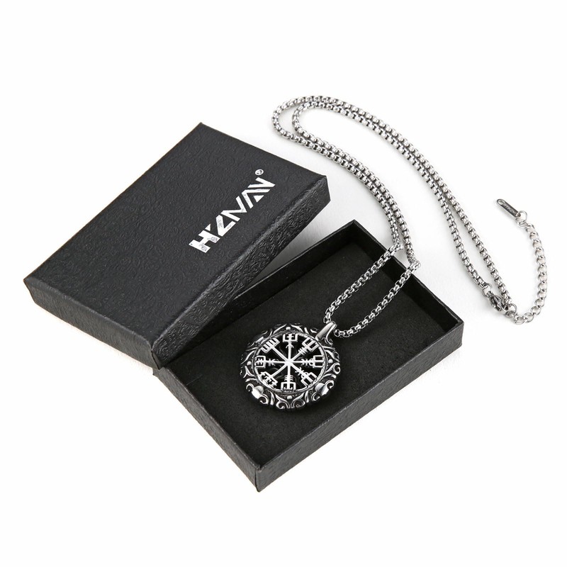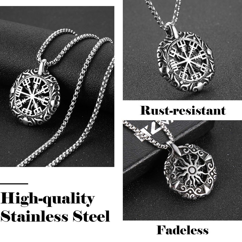 HZMAN Viking Vegvisir Norse Compass Stainless Steel Necklace Double-Sided Hollow Engraving Sun Totem Pendant Norse Amulet Jewelry (Silver)