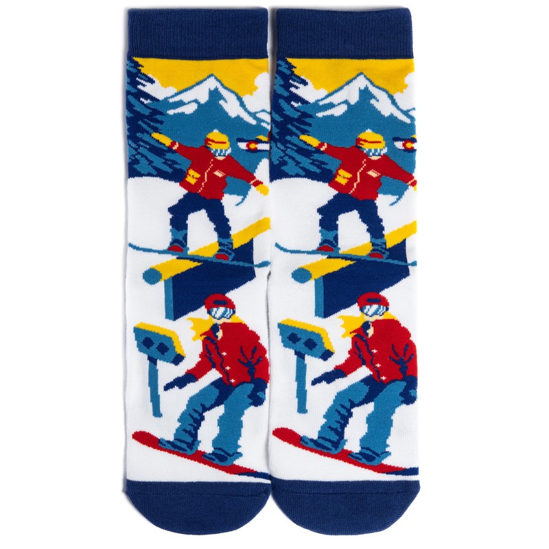 • Slide into these cool snowboard socks: Stylish snowboard themed socks that snowboarders love, with original art featuring an action packed mountain scene - plus a hidden message that any snowboarder will love: “I’d Rather be Riding”!