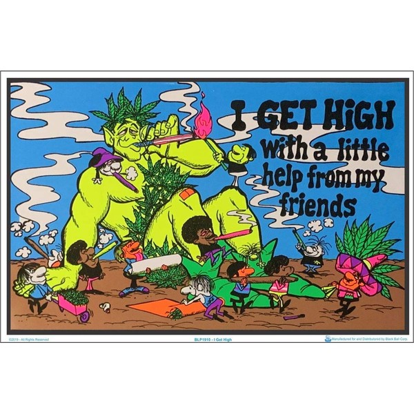 This poster image shows a blunt smoking green giant with the help of his joint smoking friends with the saying 'I Get High with a little help from my friends'.