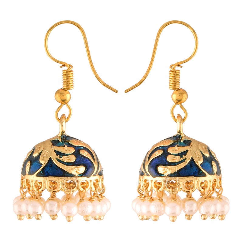 Stylish meenakari worked traditional 18k gold plated jhumka earrings with lovely combination of colors from I Jewels. These enamel earrings, made with love by our karigar with real carftmanship,will complement any occasion ethnic wear.