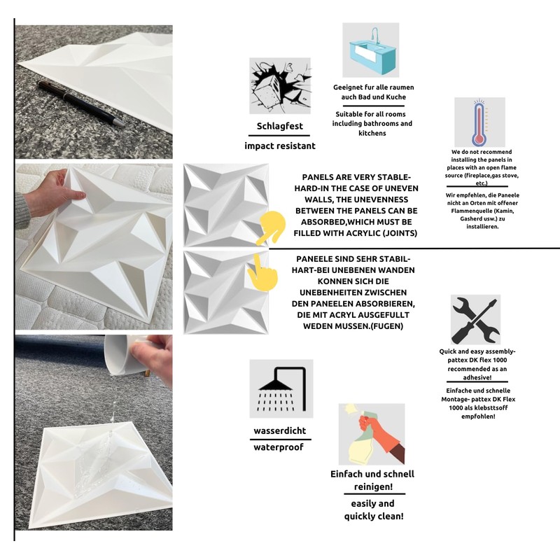 - We recommend not to install the panels in places with open flame source (fireplace, gas stove, etc.). For electric or induction cookers, keep a distance of at least 30 cm or use tempered glass as a protective plate. Panels are very sturdy - hard - on uneven walls, the bumps between the panels that are to be filled with acrylic may absorb. (Joints)