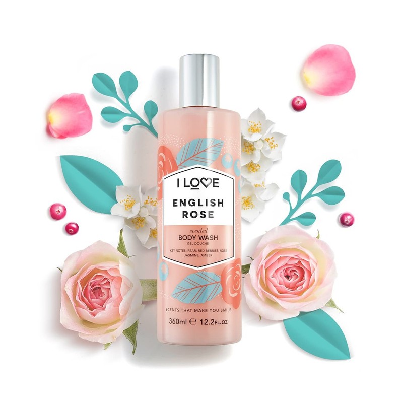 The creamy shower gel of I love contains fruit extracts, skin-friendly ingredients and Pro Vitamin B5 that leave the skin clean and soft. Suitable for daily use. Embrace modern romance with the beauty of English gardens as it unfolds like a bouquet of freshly cut flowers, a delicate fragrance of roses combined with the aroma of fresh flowers and red berries, of jasmine with amber, leaving a sparkling amber . Aromatic notes: pear, red berries, rose, jasmine, amber.