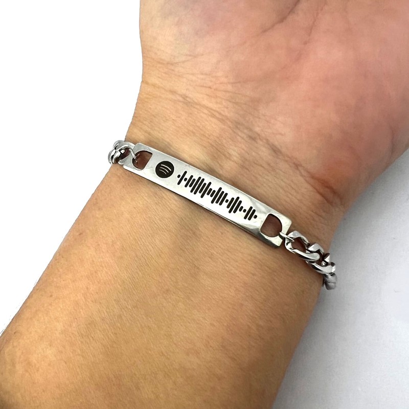 I Love Steel | Brazalete con Código de Spotify Grabado con Láser para Plasmar Cualquier Canción que se Encuentren la Plataforma de Spotify en la Placa Fabricado en Acero Inoxidable Color Plateado Unisex