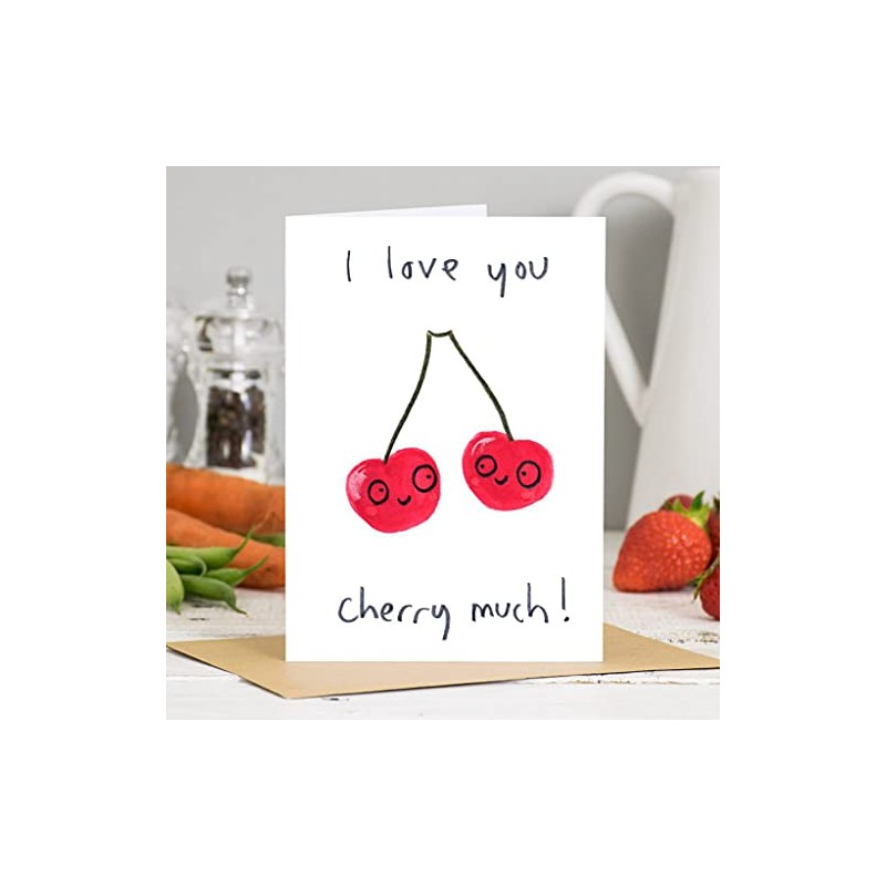 A blank greeting card with an I Love You Cherry Much fruit design printed in the UK.