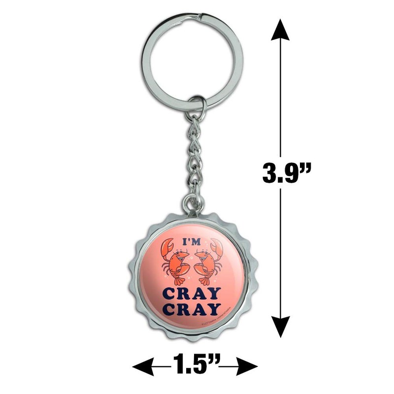 This I'm Cray Cray Crazy Crayfish Funny Humor keychain will impress your friends with its unique pop bottle cap shaped design that actually does pop off bottle caps! It's so cool, you'll look forward to using it! This bottle cap opener keychain is made of plated metal with the printed and resin-topped design shown. The pop cap is 1.5" (3.8cm) in diameter, and the entire keychain is approximately 3.9" (9.9cm) x 1.5" (3.8cm) in size.