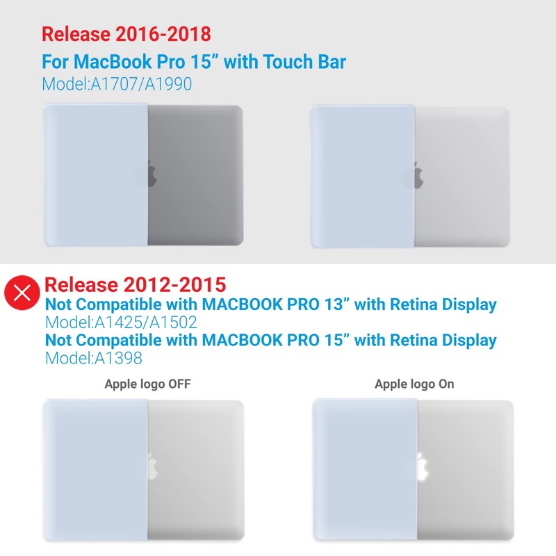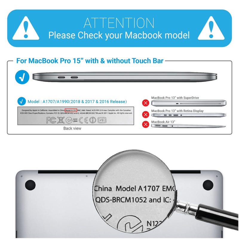 - Check Your Model: Exclusively designed for the Macbook Pro 15 Inch with Touch Bar & Touch ID released in 2019 2018 2017 2016; Models: A1990/A1707; Release 2019 –MV902LL/A, MV922LL/A, MV912LL/A, MV932LL/A and 2018 -- MR932LL/A, MR942LL/A -- and 2017 -- MPTR2LL/A, MPTU2LL/A, MPTT2LL/A, MPTV2LL/A -- Release 2016 -- MLH32LL/A , MLW72LL/A, MLH42LL/A, MLW82LL/A).
