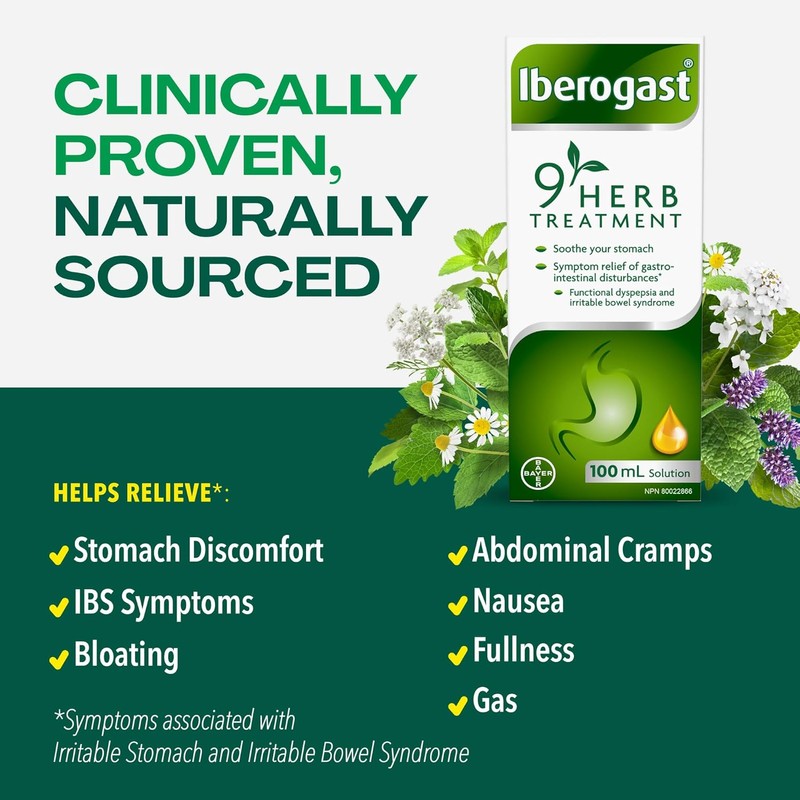Nowadays, many people suffer from stomach and intestinal problems. Disturbances in the gastrointestinal tract are usually not only unpleasant and uncomfortable, but they can often make normal everyday life feel even harder. Functional digestive symptoms can be caused by different malfunctions of the gastrointestinal tract, so some people can experience several different symptoms at once. Iberogast is a natural health product that provides sufferers with fast-acting, effective relief for multiple digestive symptoms. Iberogast relieves the symptoms associated with functional and motility-conditioned gastrointestinal disturbances such as irritable bowel syndrome (IBS) and functional dyspepsia (FD). Iberogast acts simultaneously on several parts of the digestive tract, alleviating a wide range of symptoms in the upper and lower GI tract, such as nausea, vomiting, bloating, gas, abdominal cramps, early satiety/feeling of fullness, abdominal/stomach pain. Iberogast harnesses the benefits of 9 medicinal plant extracts, that are naturally sourced, to promote symptom relief. Each bottle contains angelica root, caraway fruit, celandine herb, licorice root, bitter candytuft plant, chamomile flower, lemon balm leaves, peppermint leaves, and Mary's thistle fruit. Each of the medicinal plants in Iberogast target different causes of digestive symptoms and together they work by: - Calming stomach nerves - Reducing inflammation - Regulating stomach movement - Normalizing stomach muscle activity Iberogast is clinically proven as an effective treatment for the relief of symptoms associated with functional gastrointestinal disorders, like IBS or FD, and has an excellent efficacy profile based on over 40 years of use in Europe. In an open-label study to assess onset of symptom relief, most patients observed improvements starting within 15 to 30 minutes. To be sure this product is right for you, always read and follow the label.