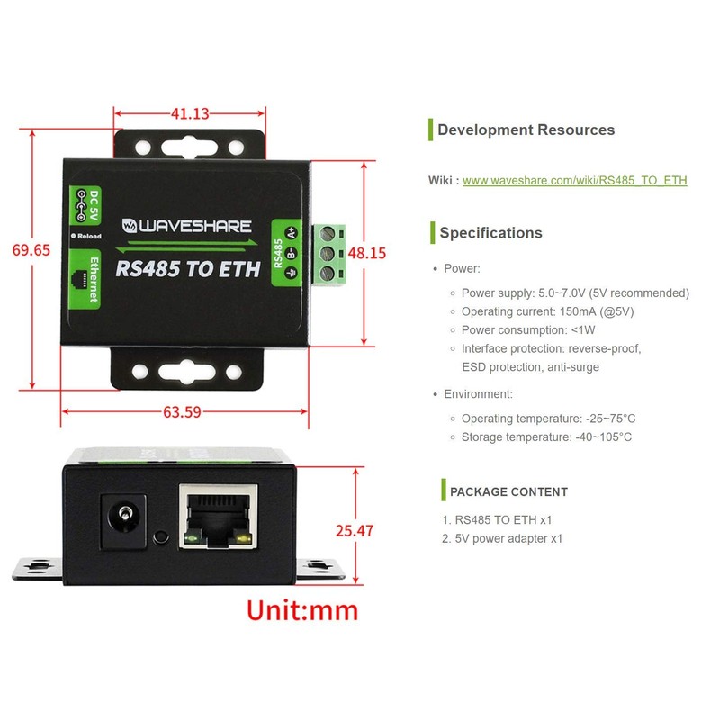 • Package Content: RS485 TO ETH x1; 5V power adapter x1;Power adapter EU head x1