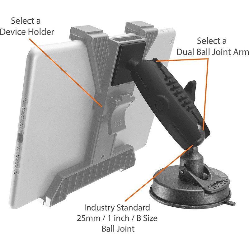 - CUSTOM- Select Customize now to select from a variety of different mounting arms (length and material) and holder attachments. The iBOLT Customizable Suction Cup mount features our Reusable “Sticky-Suction” cup and an industry standard 1 inch / 25mm / B size ball joint and can be combined with other industry standard 1 inch ball adapters and arms.