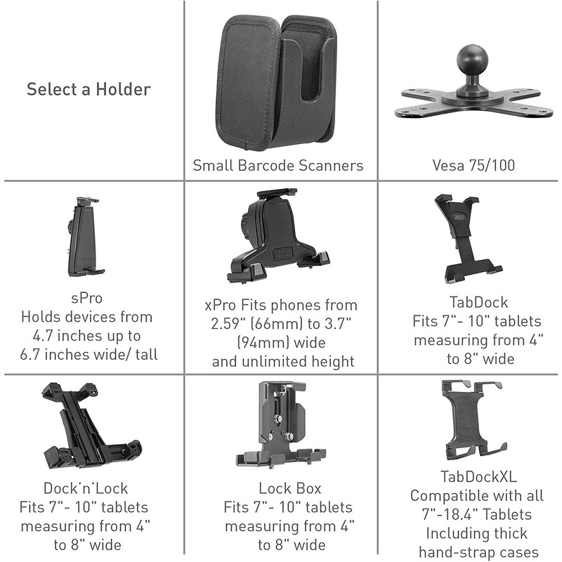 - HOLDER OPTIONS- Holders you are select from: Barcode Scanner (Small Barcode Scanners), Vesa Adapter (Vesa 75/100), sPro2 Holder (Fits devices 4.7 inches up to 6.7 inches wide/ tall), xProDock Holder (Fits phones from 2.59" to 3.7" wide), TabDock Holder (Fits 7"- 10" tablets from 4" to 8" wide), Dock’n Lock (Fits 7"- 10" from 4" to 8" wide), Metal Locking Cradle (Fits 7"- 10" tablets from 4" to 8" wide), TabDockXL (Compatible with all 7"-18.4" Tablets including thick hand-strap cases)