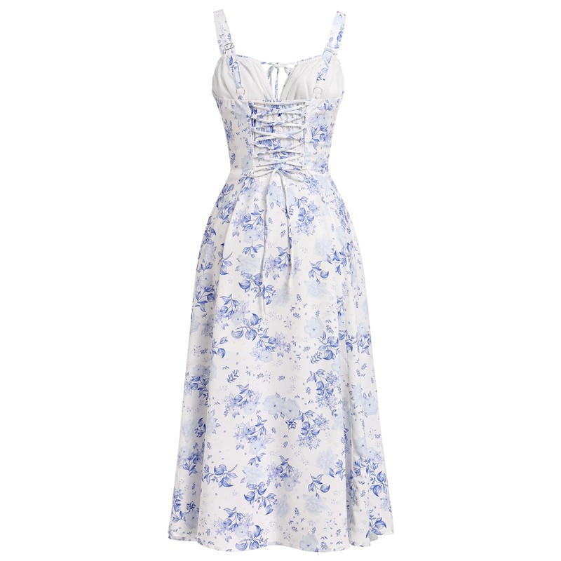 IBTOM CASTLE Women Floral Corset Dress: Ladies Boho Midi Dress Spaghetti Straps Square Neck Casual Flowy Slit Lace Up Bustier Dresses Party Going Out A Line Summer Sundress White & Blue Floral M