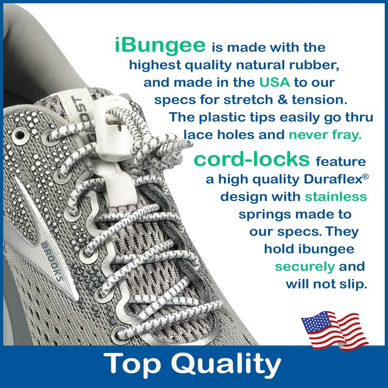 - (MADE IN THE USA) HIGHEST QUALITY BUNGEE & LACE LOCKS: iBungee is made with the highest quality natural rubber for stretch & tension. Lace locks feature a high-quality Duraflex design with stainless springs for holding the iBungee securely in place.