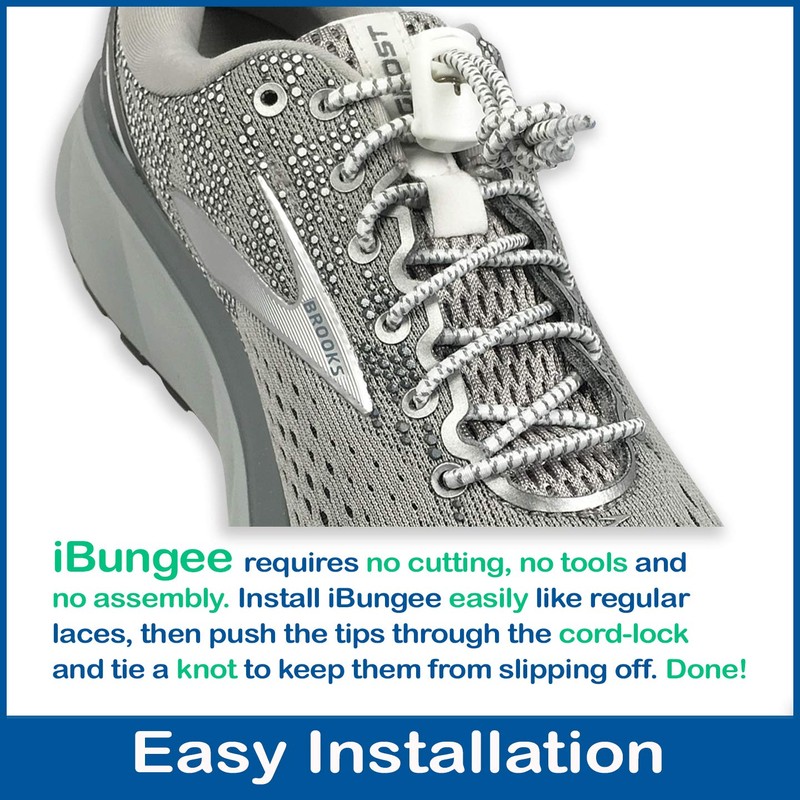- EASY INSTALLATION: Our shoelaces require no cutting, no tools, and no assembly. Install iBungee easily like regular laces, then push the tips through the lace lock and tie a knot to keep them from slipping off. Lace tips easily go thru lace holes.