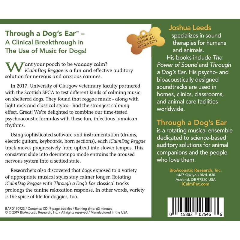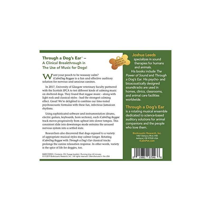 • Within these tracks you'll find bioacoustically arranged reggae music, with the right combination of tone, tempo and pattern for a therapeutic dose of calm for your canine