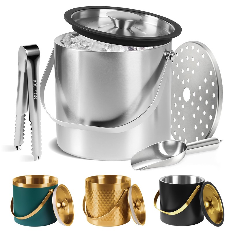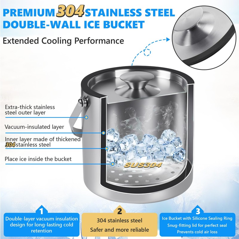 • 【MULTIPLE ACCESSORIES】Everything you need for chilling,ice bucket comes with an ice scoop,Ice Tongs,Removable filter layer,and even the Rapid-Freeze Whiskey Stones as you choose.