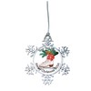 - Silver plated ornaments with silver cord hanger. Packaged in an organza bag with ribbon drawstring. Size: Bulb is 2" wide x 2.5" tall. Snowman is 1 5/8" wide by 2 5/8" tall. Snowflake is 2 1/4" One sided graphic with a silver textured back.