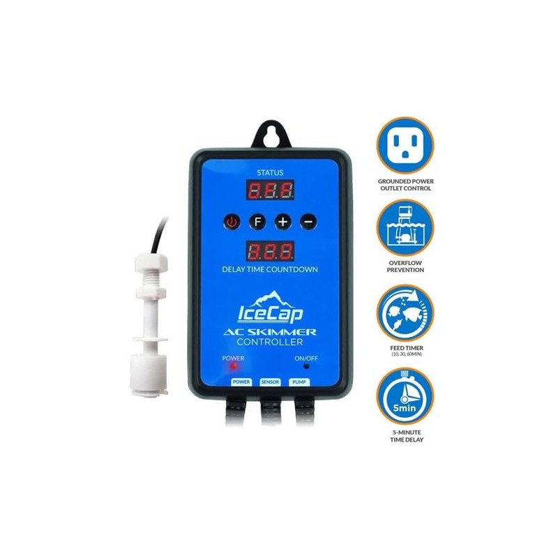 • The IceCap AC Skimmer Controller, along with connecting your skimmer to the Waste Collector, also includes a time delay and feed mode for any AC protein skimmer. The controller with a float switch sensor and a single grounded power jack supports up to 10 amps of power. Feed Timer (10, 30, 60min). 5-Minute Time Delay.