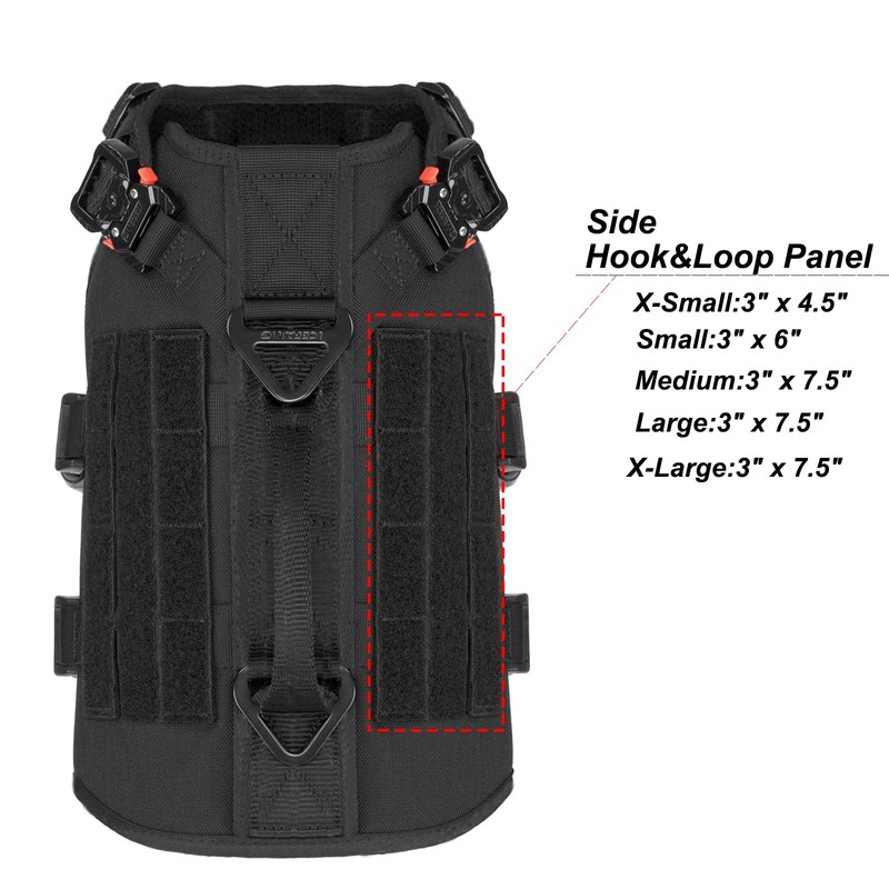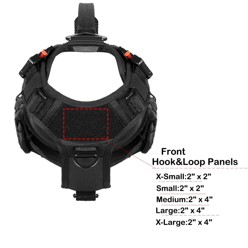 - [DOG IDENTIFIED]:Hook and Loop Panel Sewn onto Both side of harness(X-small:3"x 4.5";Small:3"x 6";Medium/Large/X-large:3"x7.5") ;One Square Loop Panel( X-Small/Small:2"x2";Medium/Large/X-large: 2"x4" )Sewn on The Front Chest ,You Can Attach Many dog Patch to Identify Your Dog