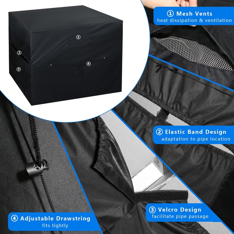 - UNIQUE DESIGN, IDEAL COVER FOR SWIMMING POOL HEATER: This pool heater cover for winter has mesh vents on the side for heat dissipation and ventilation. An elastic band is also added to the pipe opening to facilitate the adjustment of the size and position of the pipe opening, the lower velcro can be separated without disassembling the pipe to facilitate pipe passage. Designed specifically for pool heating pumps, making it the best choice for pool heating pumps.