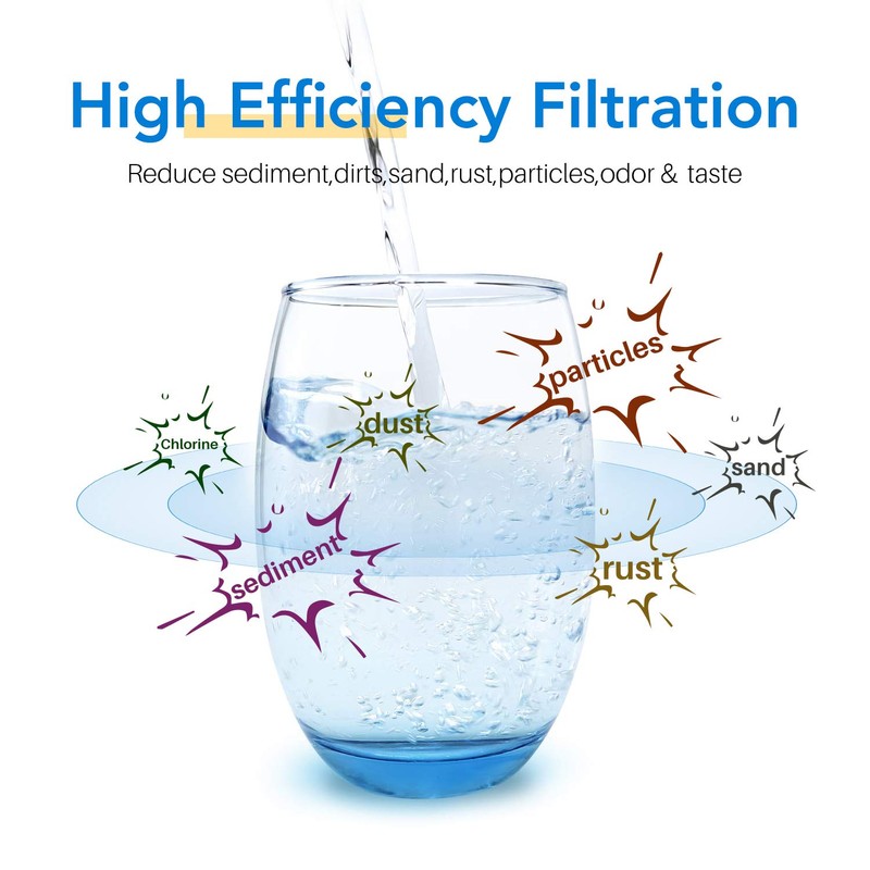 - Authoritative Certifications - Tested and certified by WQA, NSF&IAMPO against NSF/ANSI 42 to reduce 99.06% Chlorine. Reduce sand, sediments, particles, rust, color. Significantly improve the drinking water taste. The filter meets European EC1935-2004 Regulations, and Australian Water Mark, and has the certificatons of TUV, ROHS, REACH, and BPA FREE.