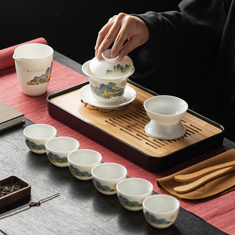 ICHAG Gongfu Tea Set, Chinese Gaiwan Tea Sets for Adults, Japanese Tea Set, 羊脂玉茶具, White Jade,Yangzhi Jade Tea Sets, 12-piece Thousand Miles Scenery (千里江山) Asian Tea Set for Home, Outdoor, Business