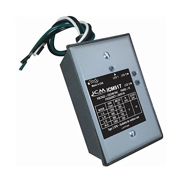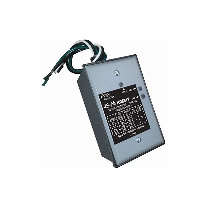 The ICM Controls ICM517 is a surge protection device designed for 120/240 VAC systems. This single-phase surge protector safeguards sensitive electronics from damaging voltage spikes. With a maximum surge capacity of 100,000 amps and an energy rating of 1020 joules, it offers reliable protection for any installation.