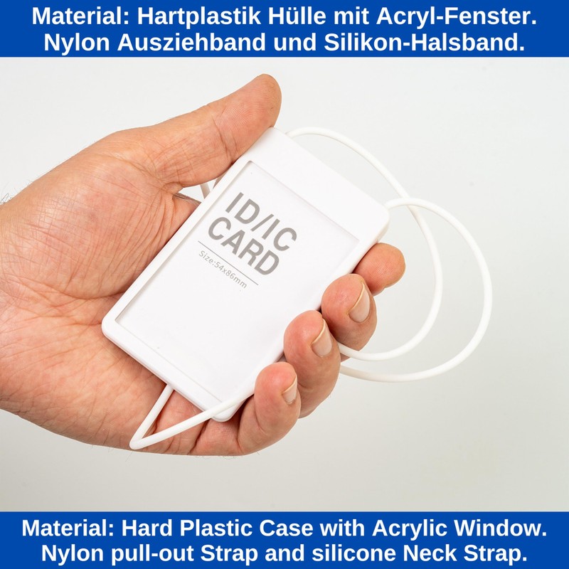 - 1 x ID and card holder, in white, 86 x 54 mm inner dimensions, silicone collar, up to 45 cm extendable card roll