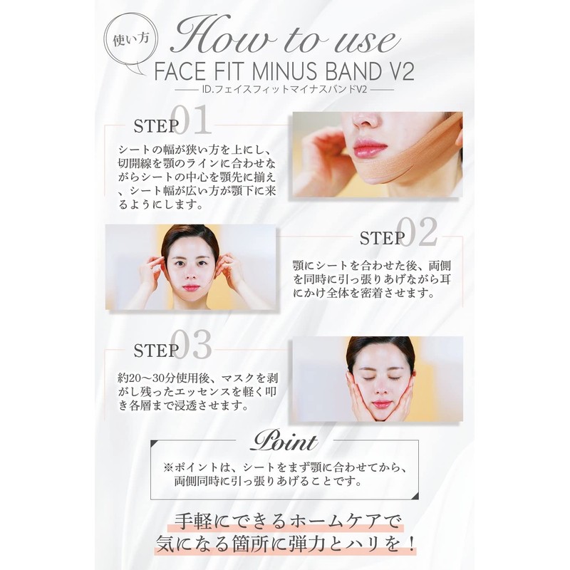• How to Use: 1. Align the center of the seat with the narrow side upward, align the incision line with the chin line, and the width of the seat should sit below the chin. 2. After aligning the seat with your chin, pull both sides together and place it on your ears to make a full fit. 3. After using for about 20-30 minutes, remove the mask and gently tap the remaining essence to penetrate the square layer. The point is that the seat should be aligned with the jaw first, then pull both sides simultaneously
