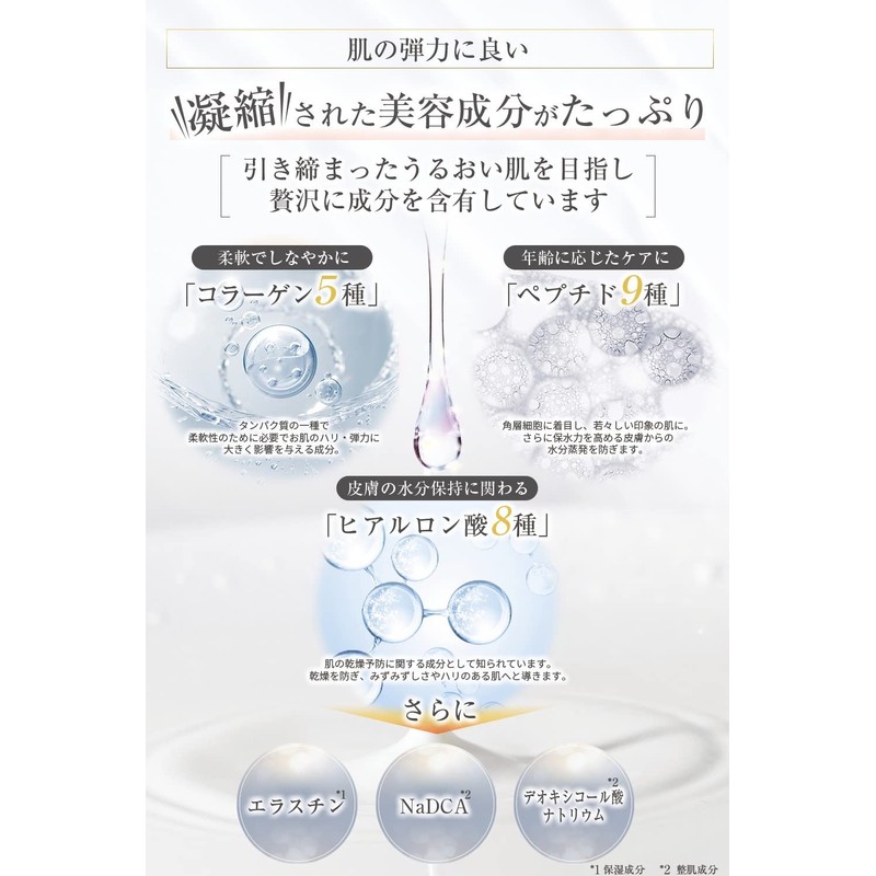 • (Plenty of concentrated beauty ingredients) We aim to achieve tight, moisturized skin and luxurious ingredients. It has 5 types of collagen, 9 types of peptides for care according to age, 8 types of hyaluronic acid related to moisture retention and condensed beauty ingredients