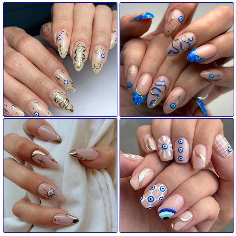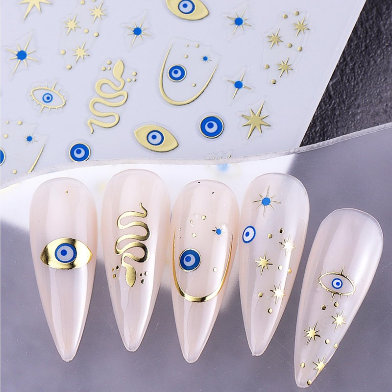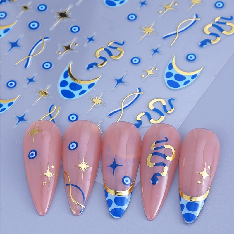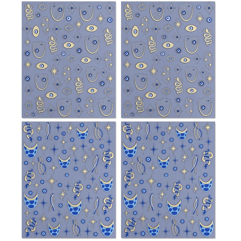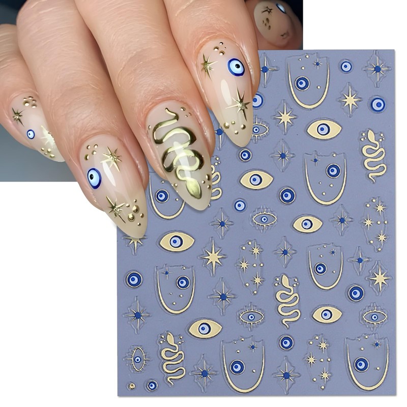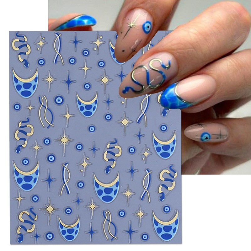 - Blue Evil Eye & Star Symbols – You’ll get 4 sheets of protective evil eye, star, and snake motifs in blue and gold tones—ideal for mystical, spiritual, or celestial-themed nail art.