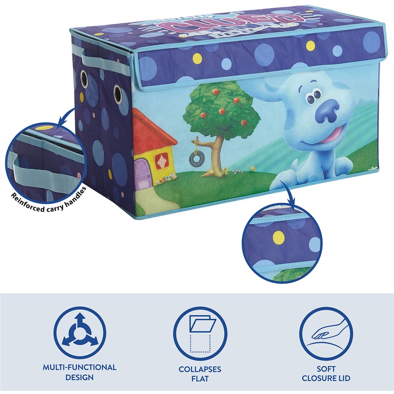 - KID FRIENDLY DESIGN: This spacious storage trunk features adorable graphics from Blues Clues. Designed in a pretty background color with Blues Clues graphics from the famous brand. The perfect addition to your child's bedroom, closet, or playroom. The design on this storage trunk will add a pop of color along with your child’s favorite characters. The collapsible storage trunk is an easy way to maintain clutter, while adding a playful accent.