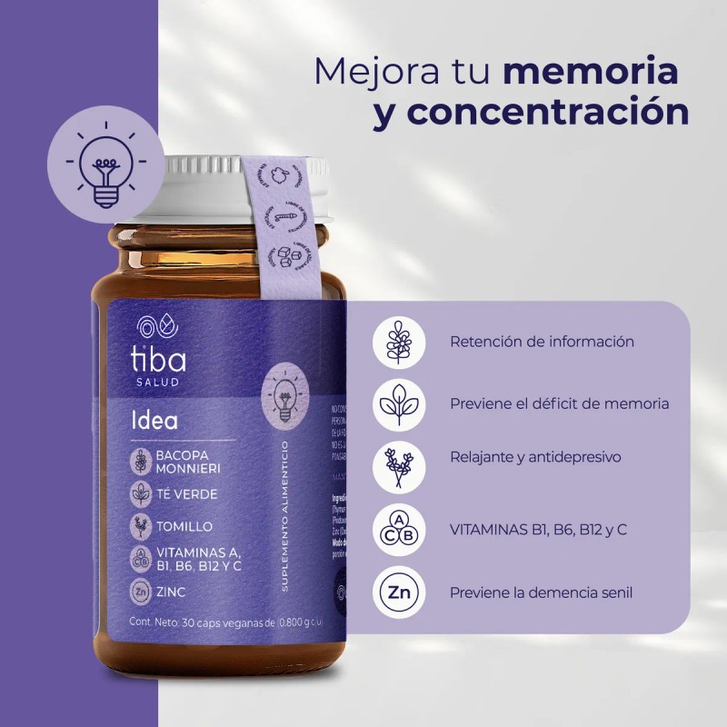 En un mundo lleno de distracciones, Idea Tiba X2 Concentración y Memoria es tu aliado perfecto para mantener tu mente enfocada y serena. 🌿 Con ingredientes de pureza excepcional, este suplemento en cápsulas es la fórmula mágica que tu cerebro ha estado esperando. Desde la tranquilidad del tomillo hasta la energía vibrante del té verde, cada cápsula está diseñada para potenciar tu concentración y memoria de manera natural.