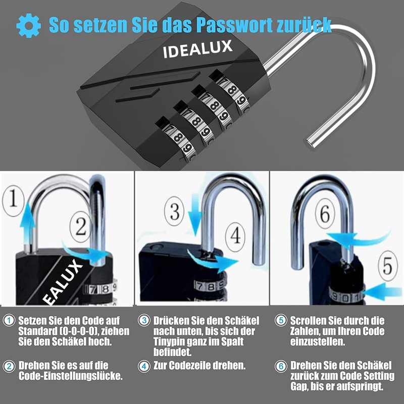 • High-quality materials, robust construction, durable and stable: the Idealux padlock is made of a high-quality zinc alloy. The shackle of the padlock is made of stainless steel, which is rust-proof and corrosion resistant. With high-strength zinc alloy body, hardened steel shackle and excellent workmanship, the lock number code is weatherproof, rust-proof and extremely resistant to cutting and sawing. It is the most durable and secure padlock.
