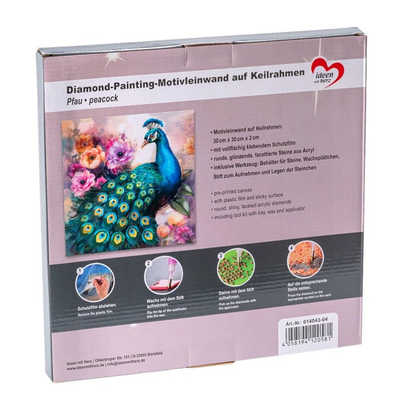 Ideen mit Herz Diamond Painting Canvas on Stretcher Frame | 30 cm x 30 cm | Set Including Tools (Peacock)
