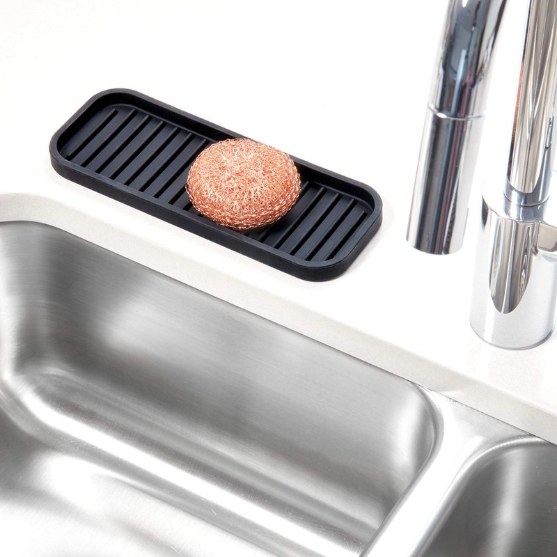 Upgrade your kitchen organization with the iDesign Lineo Sink Tray. This multi-purpose tray keeps bar soap, sponges, and scrubbers at hand near the sink while also protecting surfaces from soap residue. The inner surface of the tray features raised ridges and grooves to provide proper airflow and allow wet items to dry more efficiently after use. This versatile soap and sponge holder can also be used by bathroom, laundry room, or utility sinks, and it is also heat resistant up to 570 degrees Fahrenheit for use with hot tools. The modern design and sleek black color match a variety of home decor styles. Made with durable BPA-free flexible silicone, this sink organizer stands up to every day use and is dishwasher safe for easy clean up. This organizer tray measures 9" x 3.5" x 0.5" and is ideal for use in compact spaces on countertops. With iDesign by InterDesign, you can #LiveSimply every day.