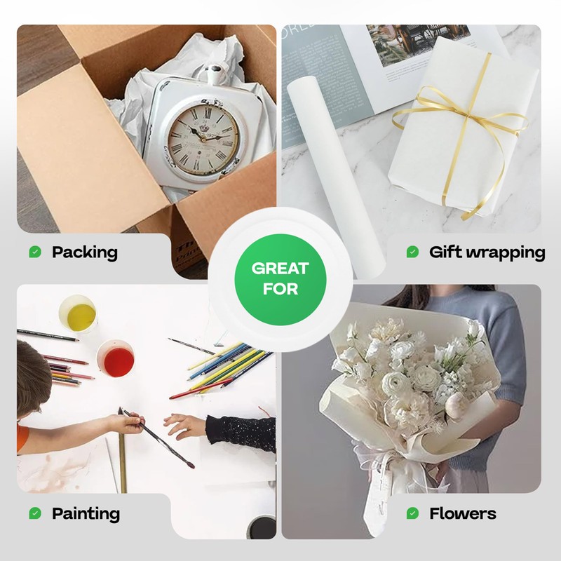 • EFFICIENT PACKAGING SOLUTION: Protect your goods during transport or storage with our roll of white paper. Its flexibility allows it to perfectly fill voids and absorb impacts, protecting objects from damage and preventing moisture condensation.