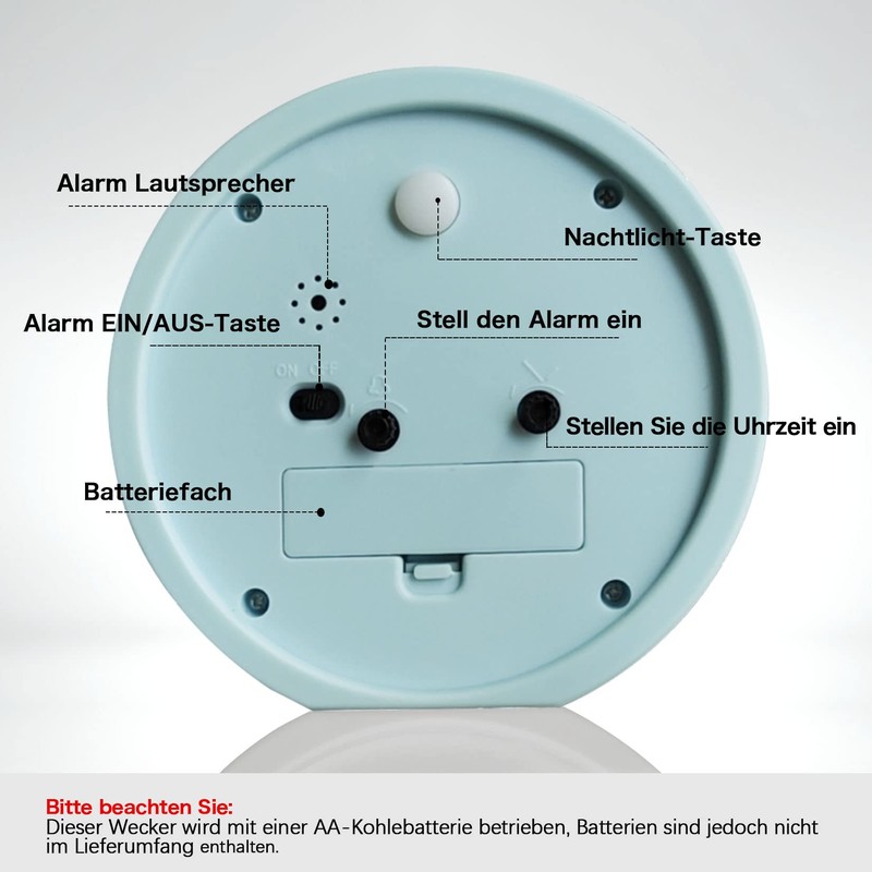 • Easy to use: all settings are on the back of the children's alarm clock, setting the time is only a matter of the rotary wheel, the alarm clock can be easily switched on and off via the on/off switch on the right, and there is a button to light up at night.