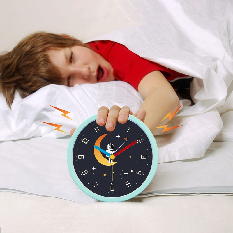 Idota Alarm Clock Children Boys Moon Landing Astronaut Learning Alarm Clock Silent Children's Alarm Clock with Night Light Round Children's Alarm Clock for Beginners to School Portable Travel Alarm