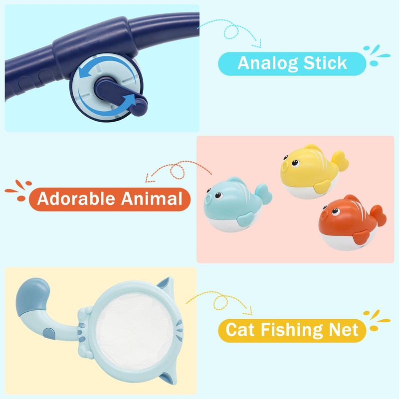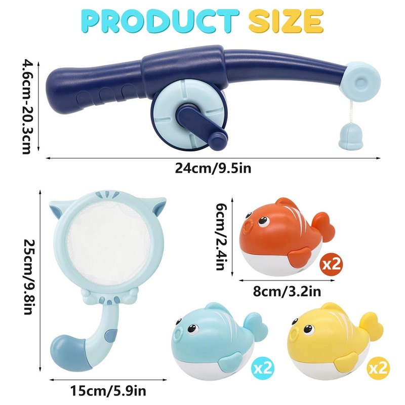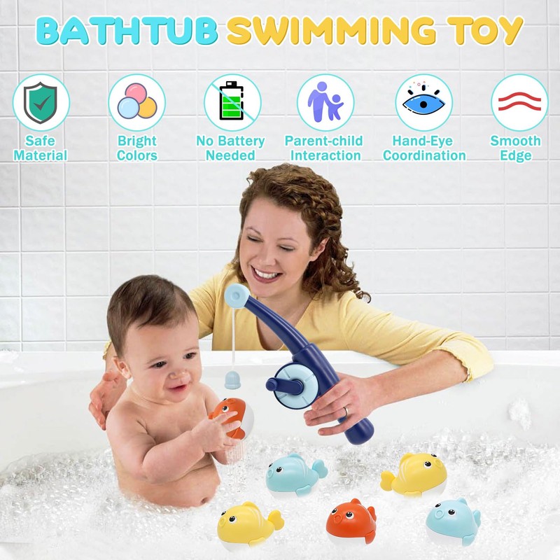 - Fishing game bath toy: the bath toy set contains 1 magnetic fishing rod, 6 clockwork swimming toys and 1 fishing net. An interesting combination of bath toys for toddlers, allows the baby to enjoy more bathing fun without crying.