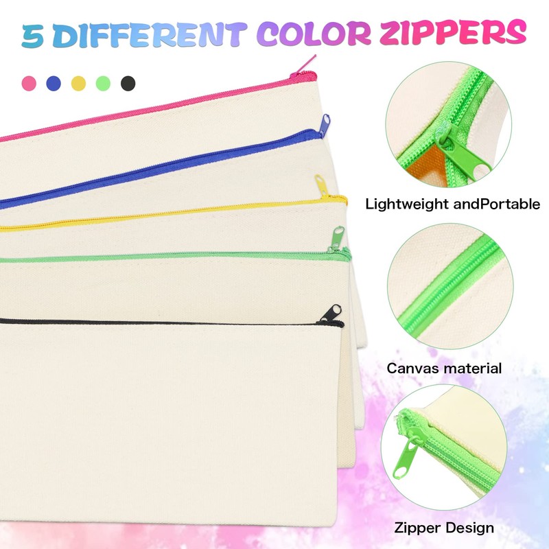 Idota 20 Pack Canvas Zipper Bags Blank DIY Craft Pencil Case Multipurpose Makeup Bags for Pen Cosmetic Bill Travel Toiletries 5 Colors Zippers